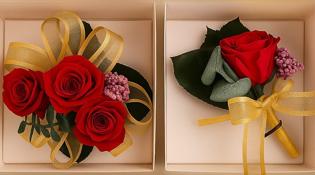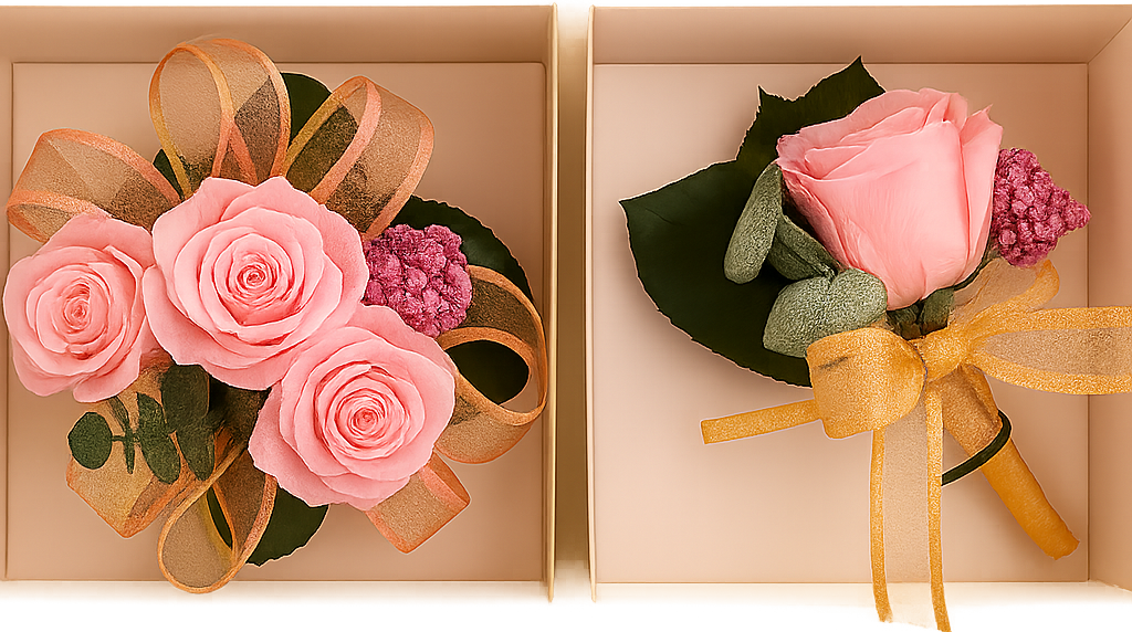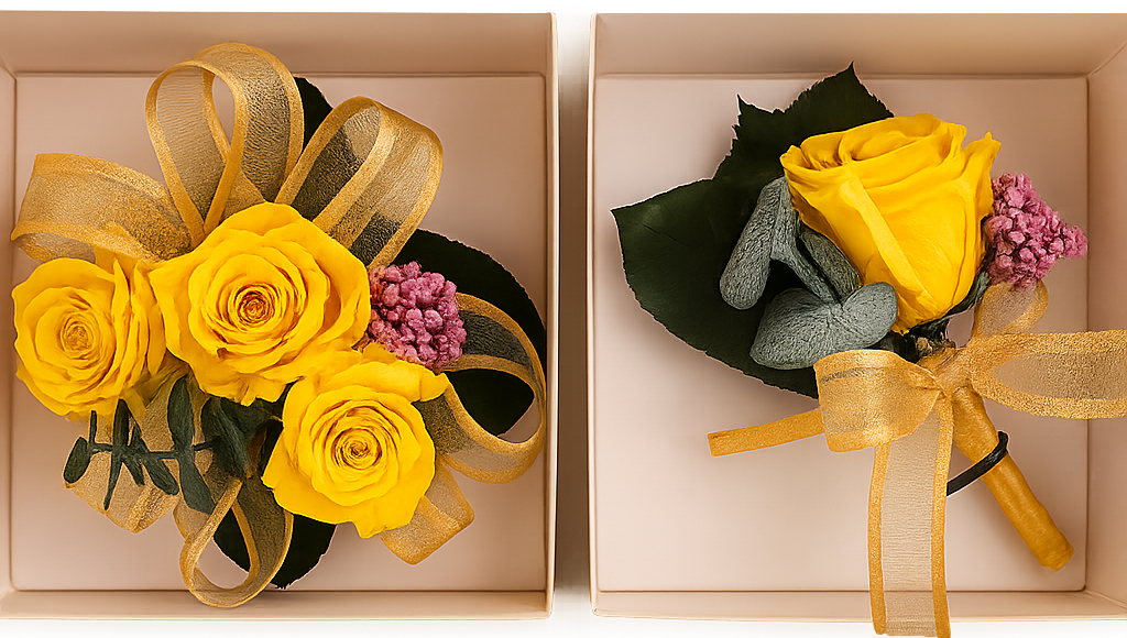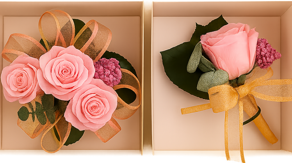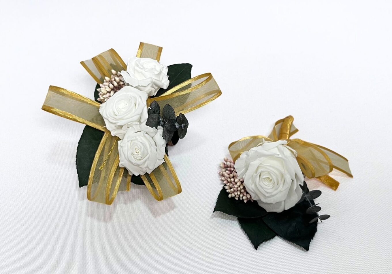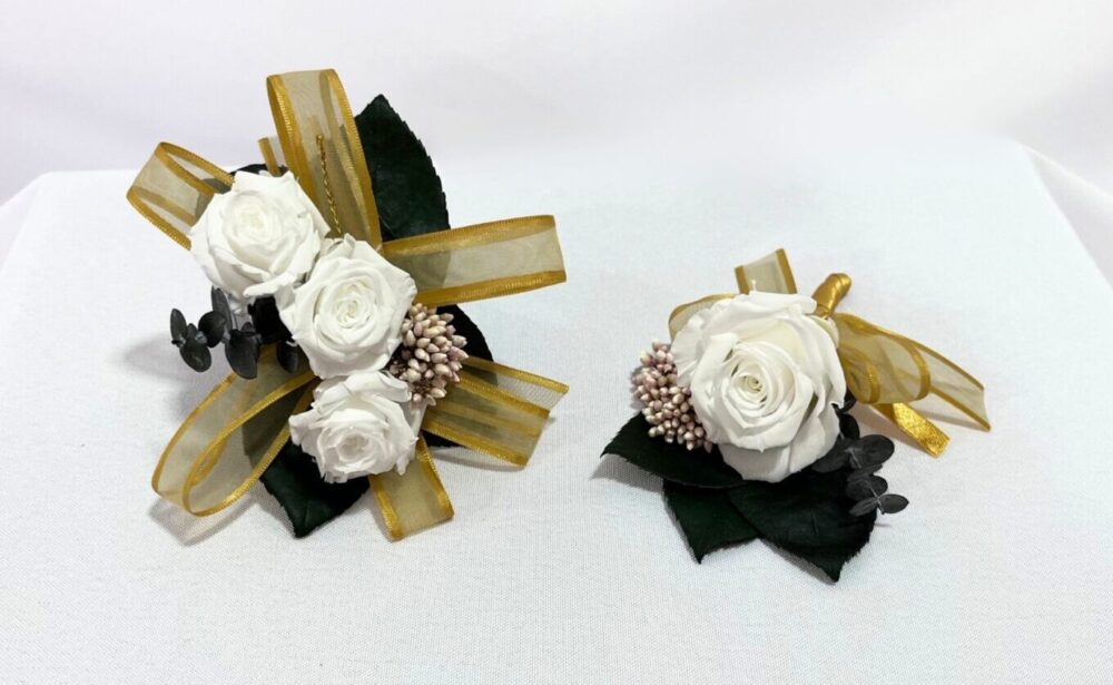 Our preserved rose corsage & boutonniere can stay beautiful for up to 6 months.