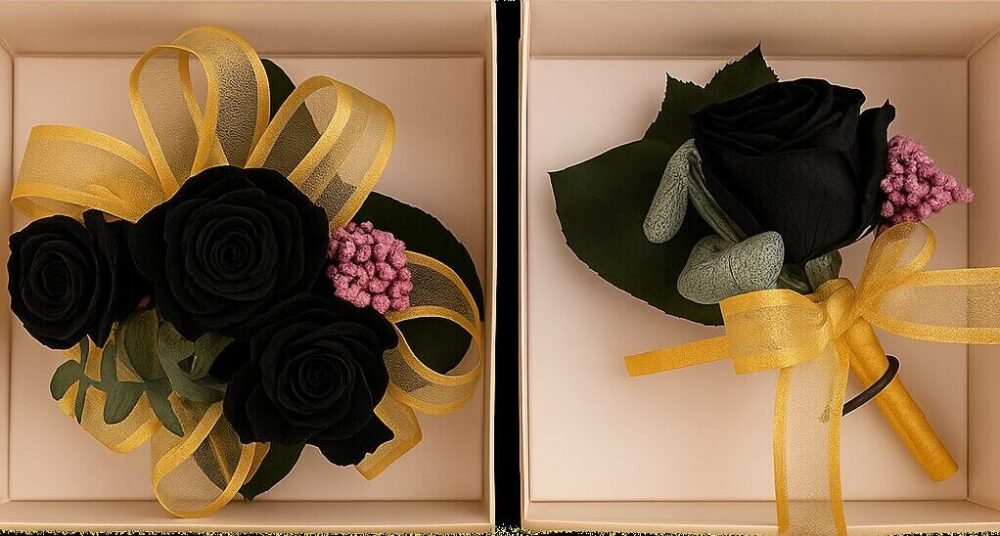 🌸 Tap “Add to Cart”, customize your rose and ribbon tones, secure your delivery date (1+ day in advance), and wear the celebration with timeless grace. Your golden moment awaits!